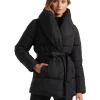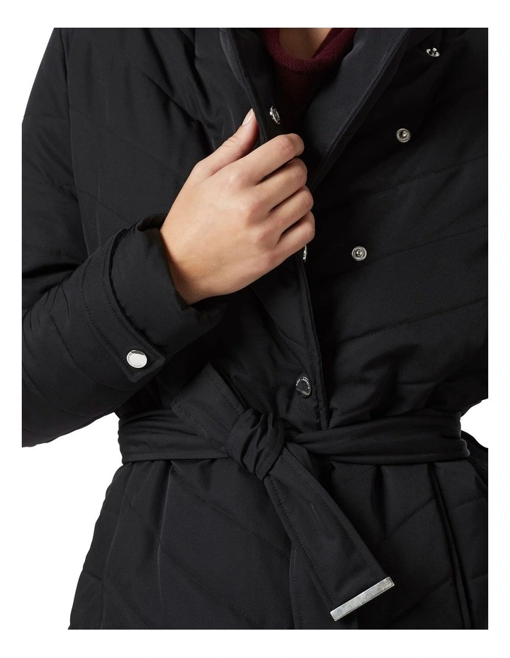 Revealing a soft quilted effect, this black puffer jacket is made from 100% recycled polyester, with internal wadding for warmth. Showing off a flattering wrap style with a stand collar, the jacket fastens at the front with silver snap closure buttons, featuring a self-tie belt to create definition at the waist. Further detail is offered in theΒ side pocketsΒ and button-tab feature at the cuff.