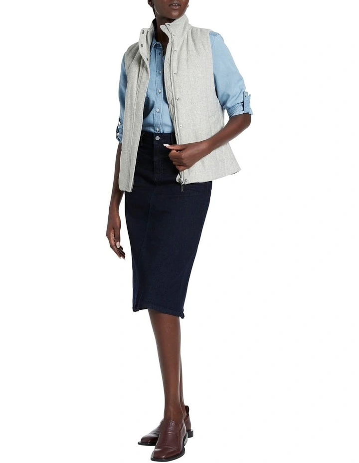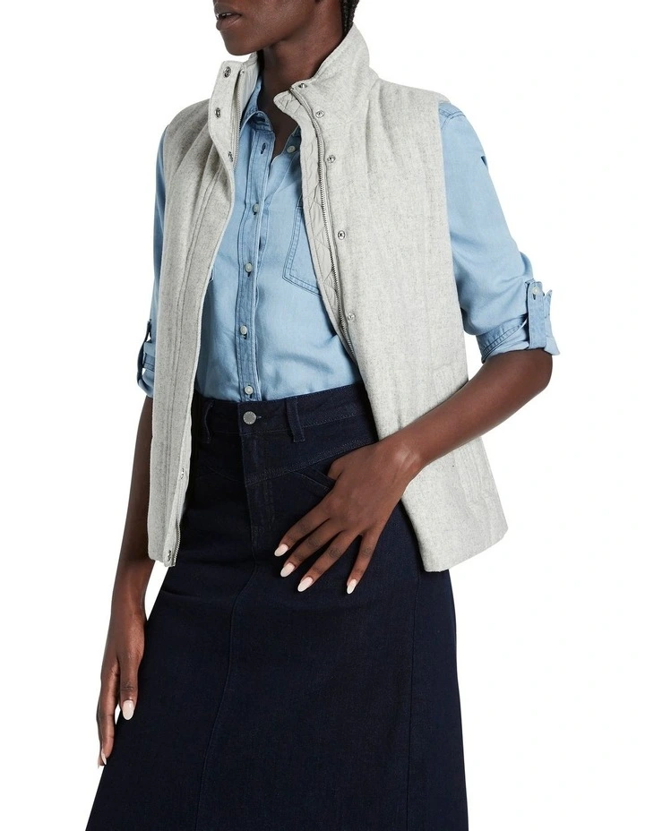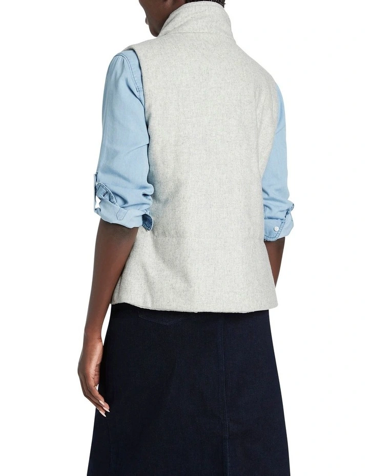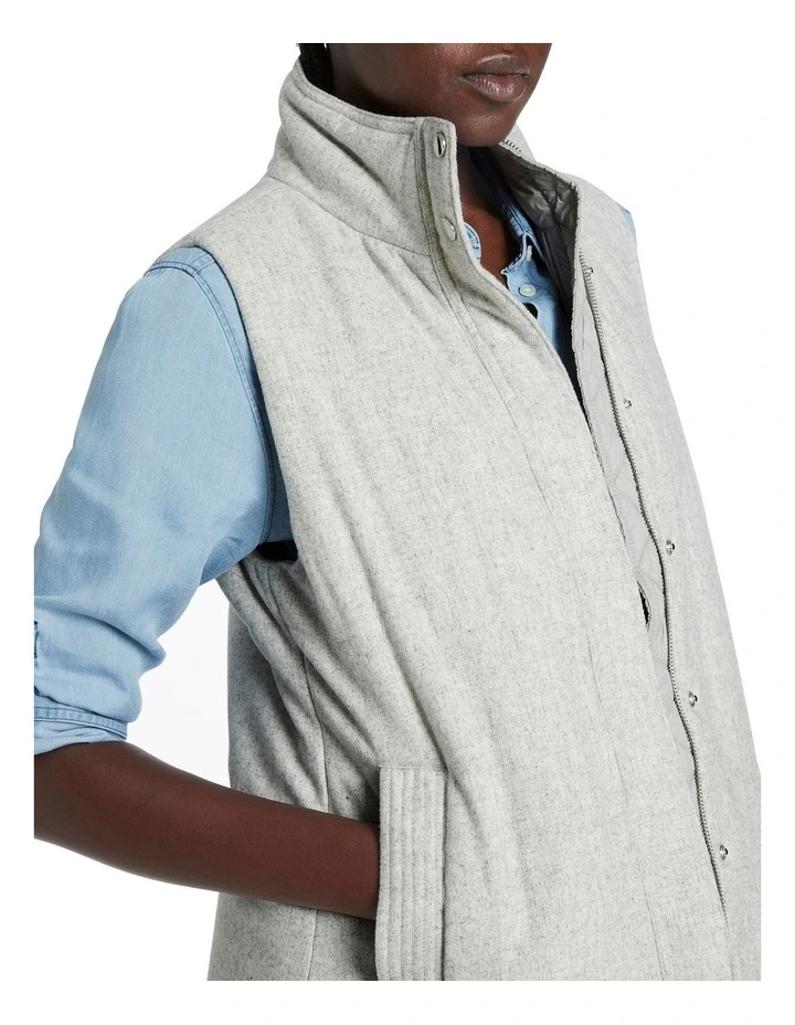 Stay warm as temperatures start to drop wearing this effortless gilet, made from a soft wool blend in pairable grey melange. Reversible in its design, the gilet fastens at the front with a zip and snap button closure to create a funnel neckline. Wool side out, the gilet features angled zipped pockets with topstitch detailing. Reverse side out shows off stitched padding and side seam zip pockets.