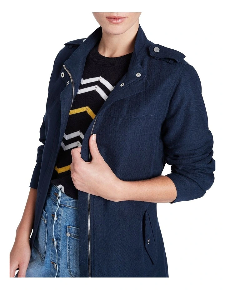 The perfect layering piece for in-between temps, this navy jacket remains warm and breathable in a soft cotton and linen blend, featuring full lining for added warmth. Fastening at the front with a concealed zip and press stud closure, the jacket reveals a longline silhouette drawn in at the waist with a removable self-tie belt, with further detail found in epaulettes and buttoned hip pocketing.