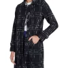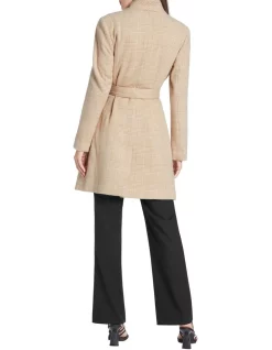 Beautifully styled, this long-line coat reveals softly tailored fit-and-flare shaping, drawn in at the waist with a self-tie fabric belt. Flaunting a textured check within a neutral camel colouring, the coat is further accentuated by a curved stand collar and an asymmetric fastening secured with statement rose gold buttons, with handy hidden pocketing at the hip.