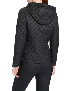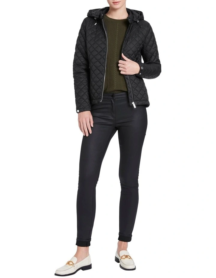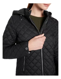 Lightweight yet warm, this black jacket flatters within a slim, figure-hugging fit, while showing off a quilted diamond design accentuated by shiny silver detailing. Fastening at the front with an exposed metal zip, the jacket is further enhanced by zipped pocketing at the waist, snap button cuffs, and a removable zip-off hood with elasticated toggles for an adjustable fit.