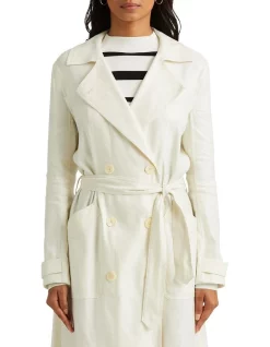 A timeless classic, Lauren Ralph Lauren’s double-breasted trench coat is updated for the season in lightweight linen twill.