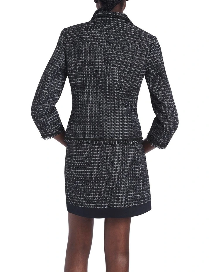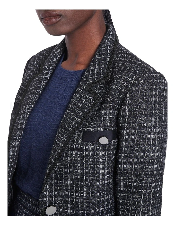 Beautifully textured, this soft tweed blazer reveals shimmering metallic accents within a rich navy blue, accentuated by navy scalloped lace trim and fringe detailing. Fully lined, the blazer flatters within a softly tailored, single-breasted design, with further detail offered in button-down feature pocketing at the chest and hip.