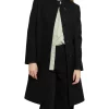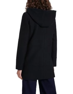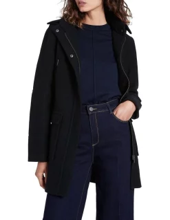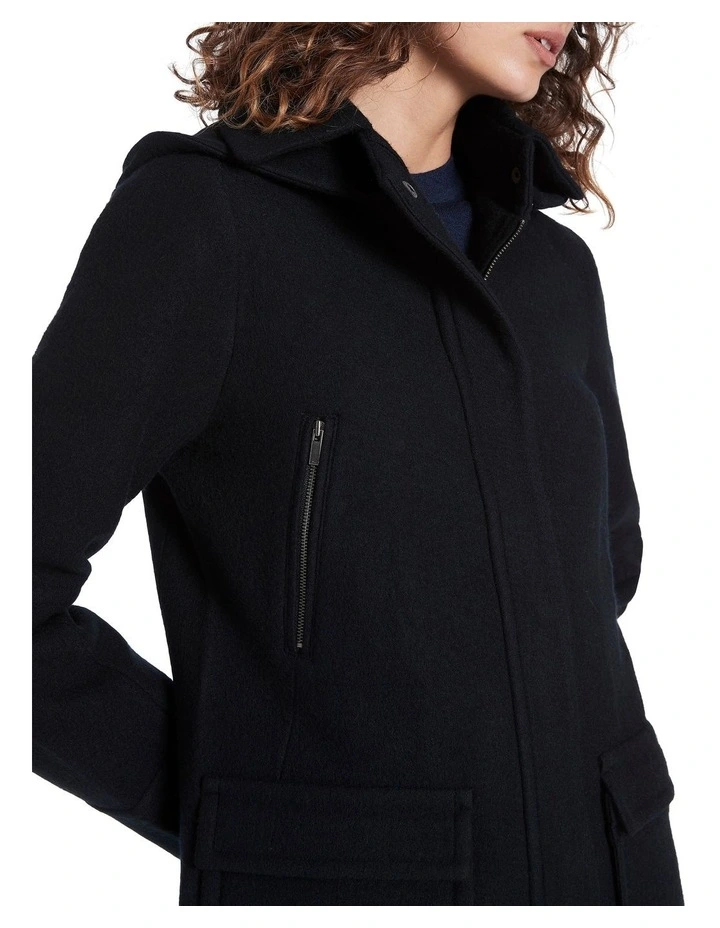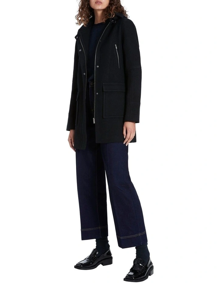Lightweight yet warm, this black coat is made from pure Australian Merino felted wool, utilising a knitted fabrication designed to allow stretch and comfort. Revealing effortless parka styling, the coat fastens with a concealed zip and snap button front closure, with further detail found in its full removable hood, angled zip pockets at the chest, and flap patch pockets at the hip.