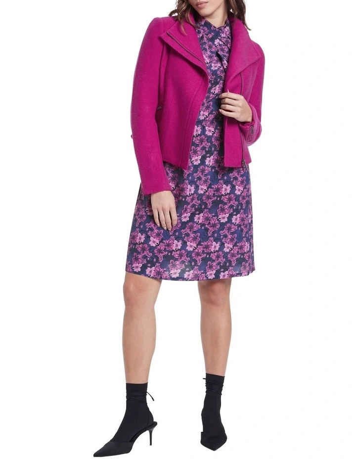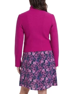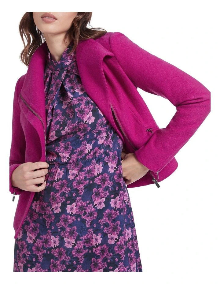 Made from pure Australian Merino wool, this plum felted wool jacket is warm yet lightweight, utilising a knit stitch that promotes stretch and comfort. Fastening at the front with a concealed zip closure, the jacket is further enhanced by angled zip pockets, a zip closure at the cuff, and dyed-to-match rib trim inserts under the sleeves that allow for easy movement.