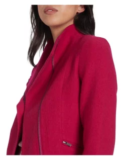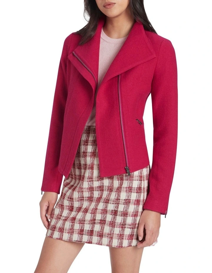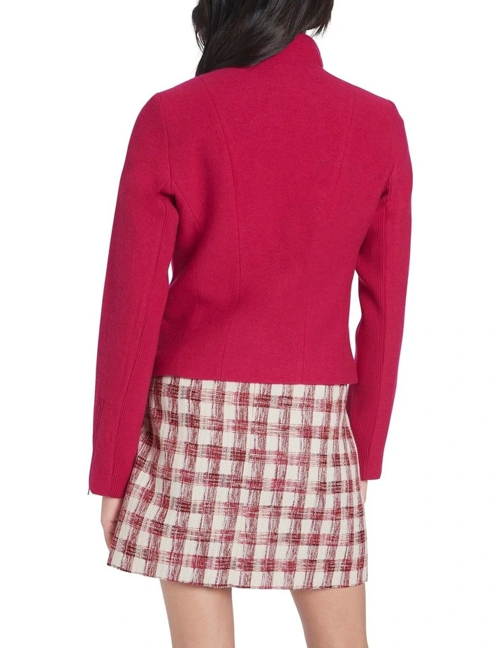 Made from pure Australian Merino wool, this punch pink felted wool jacket is warm yet lightweight, utilising a knit stitch that promotes stretch and comfort. Fastening at the front with a concealed zip closure, the jacket is further enhanced by angled zip pockets, a zip closure at the cuff, and dyed-to-match rib trim inserts under the sleeves that allow for easy movement.