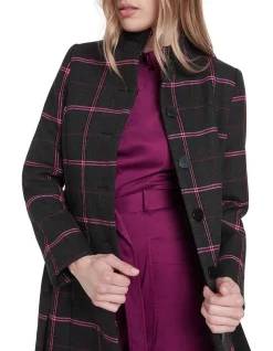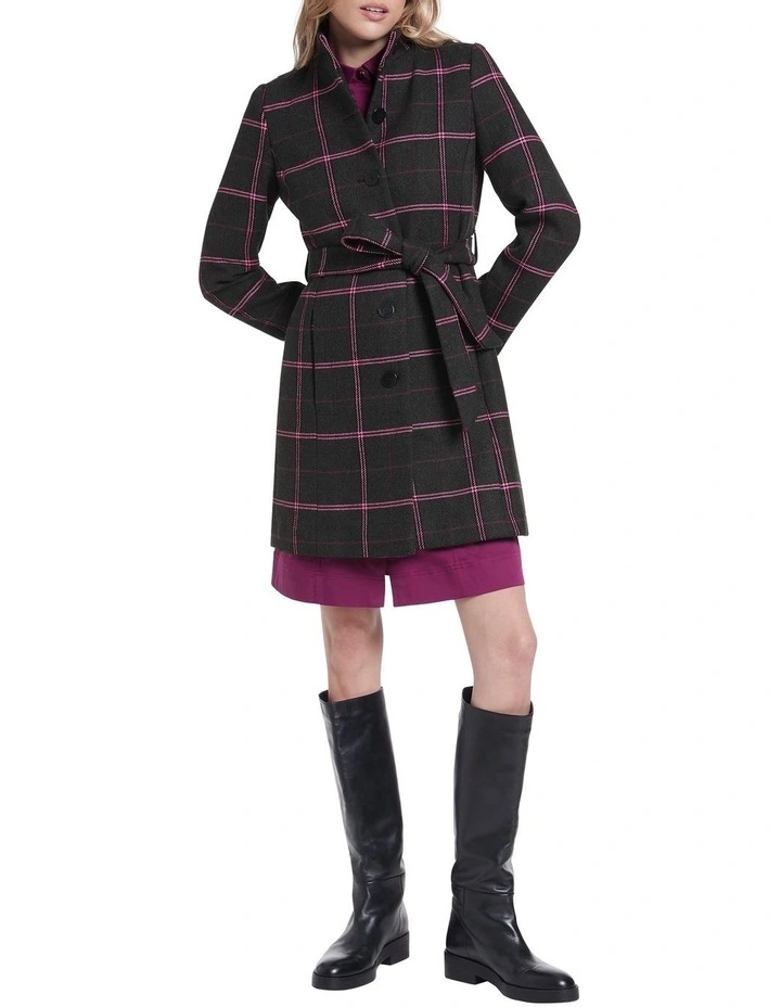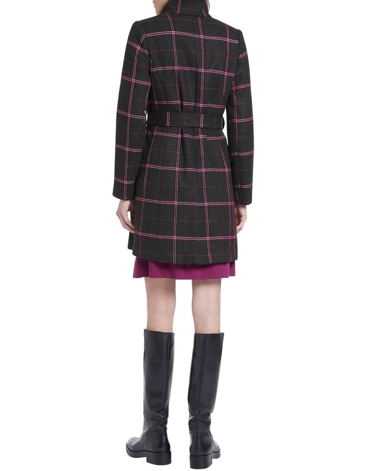 Flaunting a bold pink check, this wool blend coat reveals long-line shaping, drawn in at the waist with a self-tie fabric belt. Fully lined for added warmth, the coat fastens at the front with contrast feature buttons to create funnel shaping through the neckline, finished with open pocketing at the hip and a centre-back vent to enhance movement and fit.