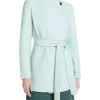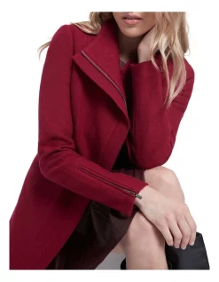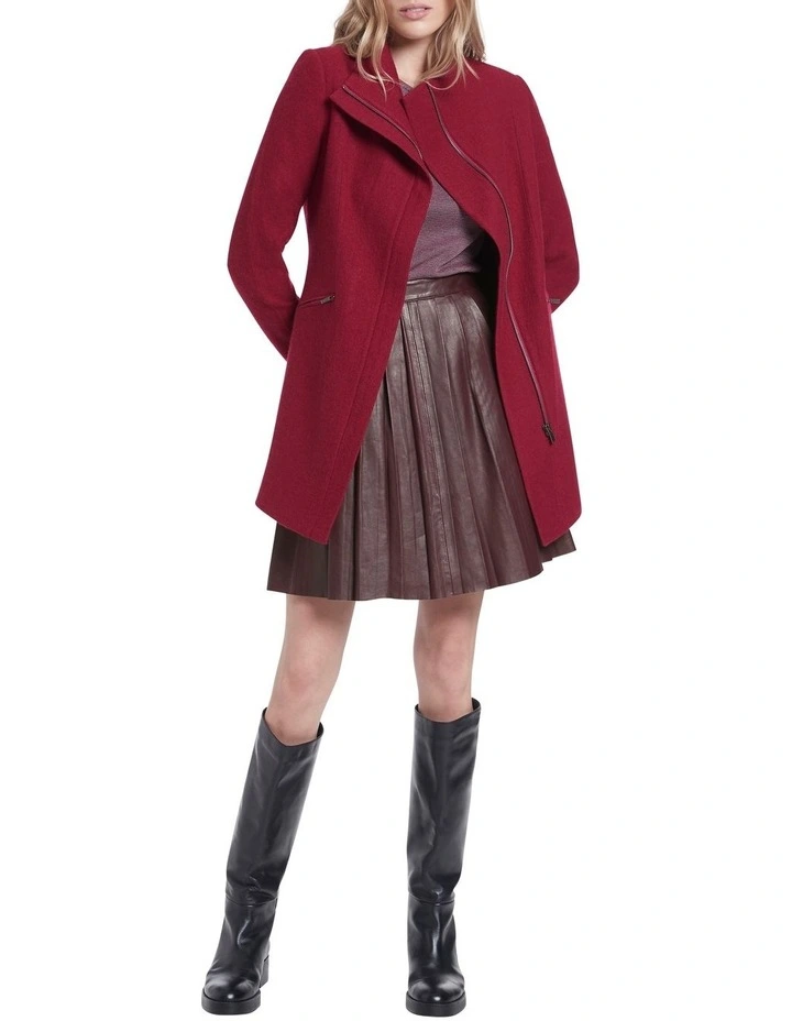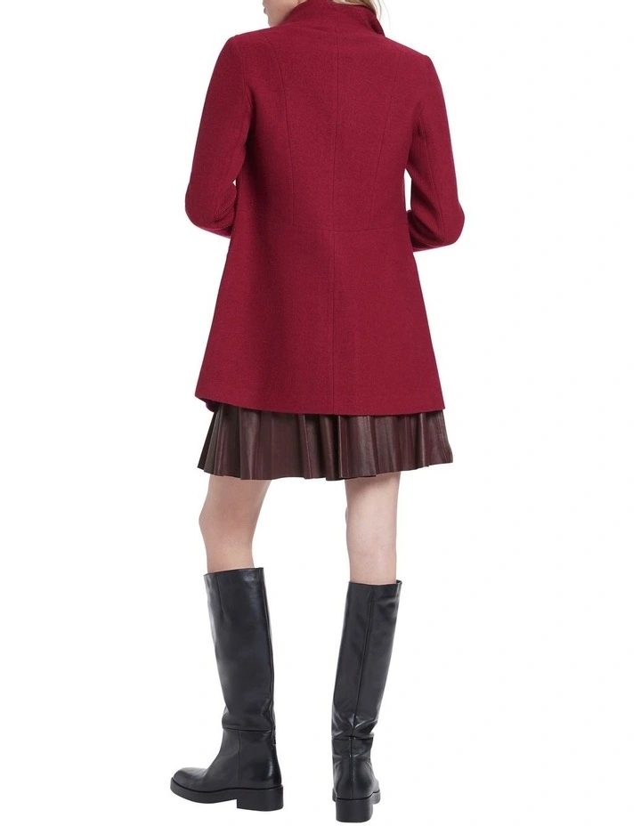 Utilising a knitted fabrication for stretch and comfort, this long-line coat is lightweight yet warm, made from pure Australian Merino felted wool in garnet red. Fastening at the front with a concealed zip, the jacket creates a neat fit with a stand collar when fastened, with further detail found in angled zipped pockets at the hip and dyed-to-match rib panels under the arm for movement.