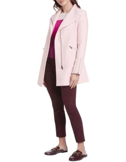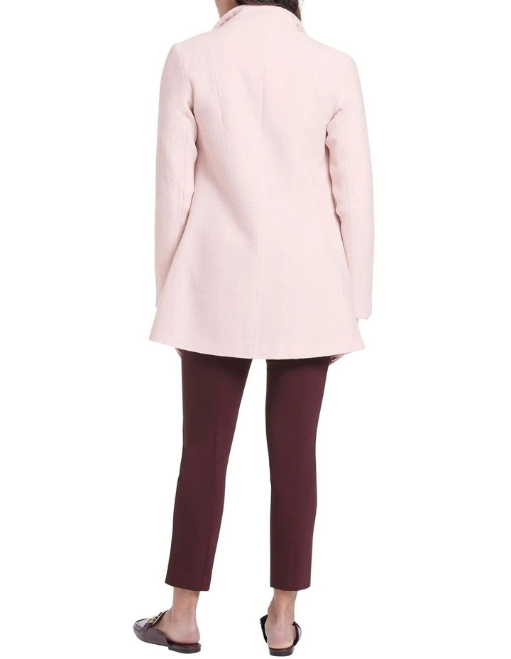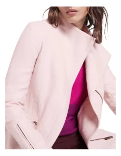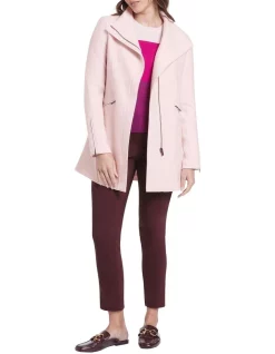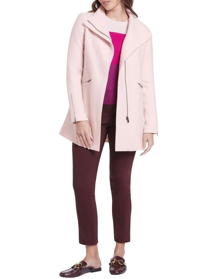 Utilising a knitted fabrication for stretch and comfort, this long-line coat is lightweight yet warm, made from pure Australian Merino felted wool in shell pink. Fastening at the front with a concealed zip, the jacket creates a neat fit with a stand collar when fastened, with further detail found in angled zipped pockets at the hip and dyed-to-match rib panels under the arm for movement.