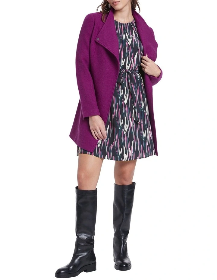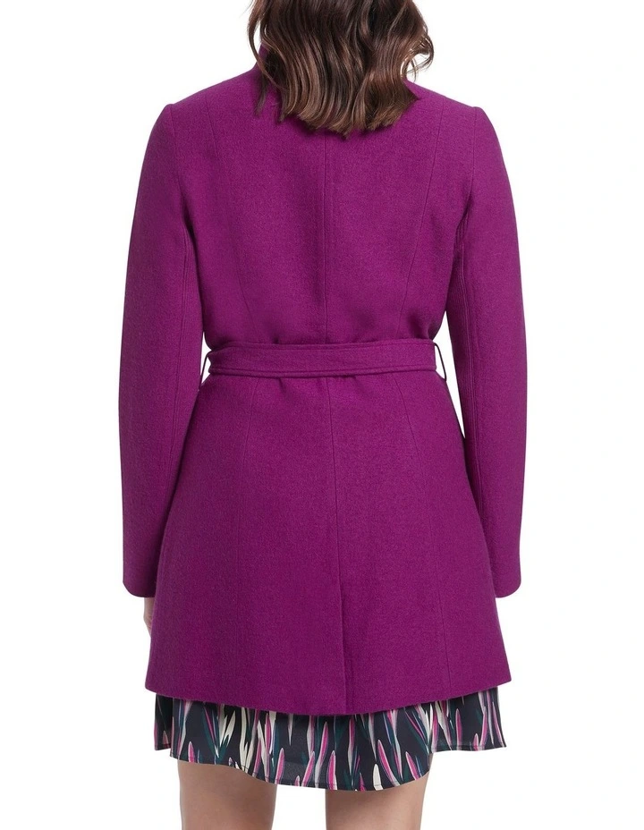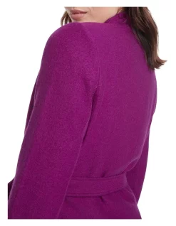Made from pure Australian Merino wool, this rich magenta coat has been knitted rather than woven to ensure easy stretch and movement, while remaining warm and lightweight. Wrapping across the chest, the coat creates a long-line silhouette, fastening with a draped self-tie belt and metal snap closure buttons, complete with pockets at the hip.Β