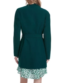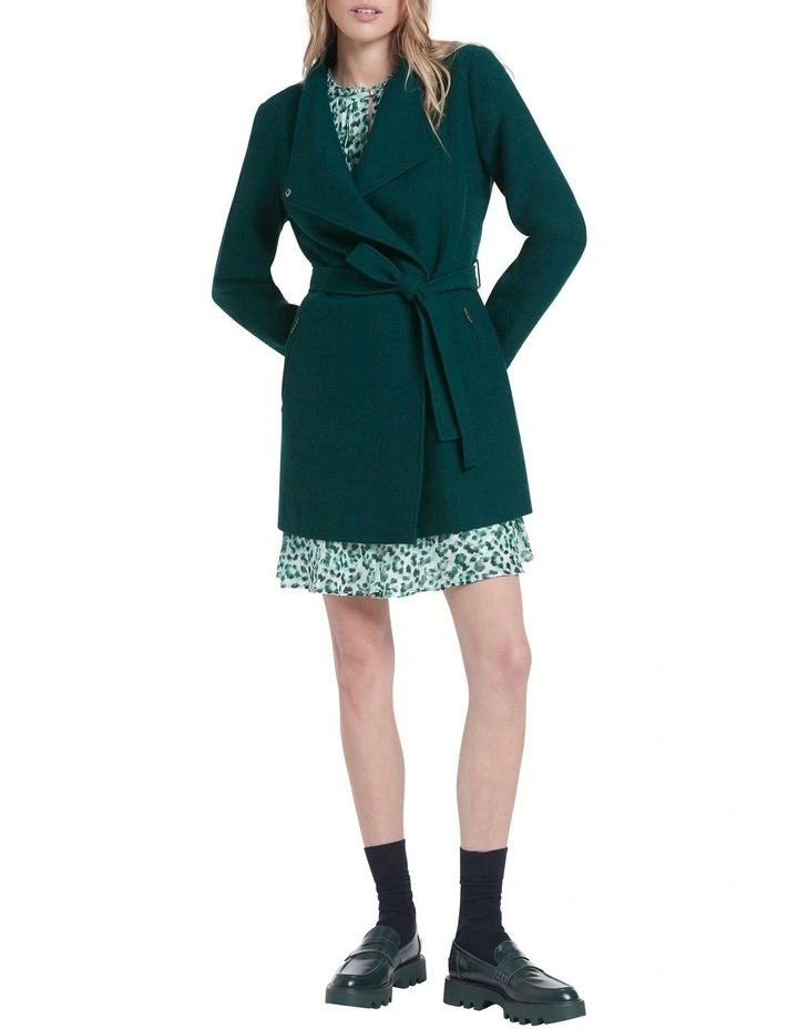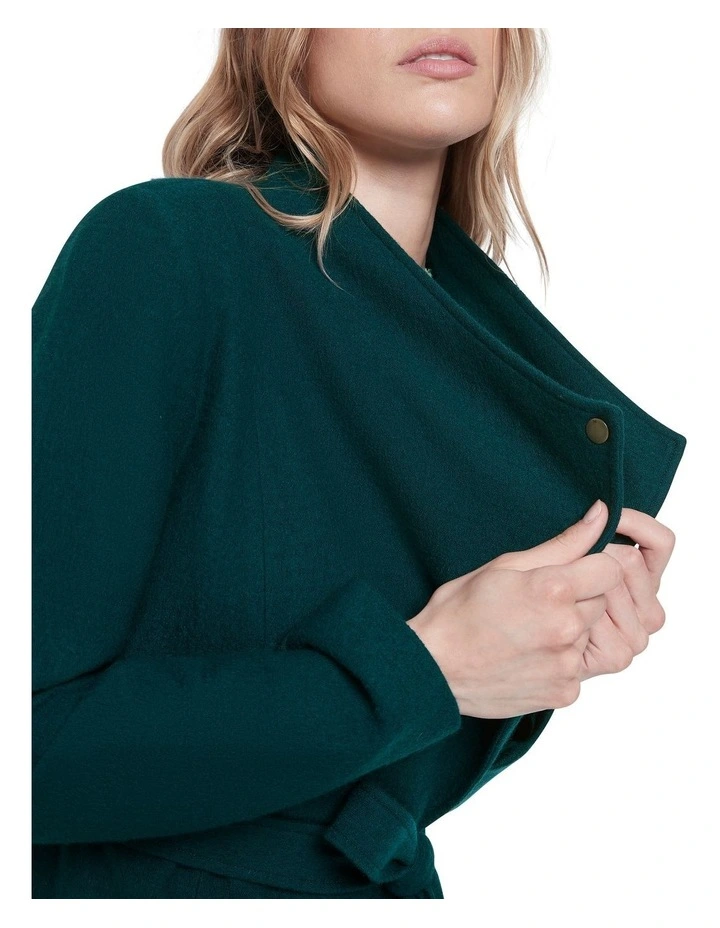 Made from pure Australian Merino wool, this pine green coat has been knitted rather than woven to ensure easy stretch and movement, while remaining warm and lightweight. Wrapping across the chest, the coat creates a long-line silhouette, fastening with a draped self-tie belt and metal snap closure buttons, complete with pockets at the hip.Β
