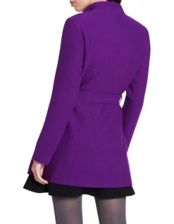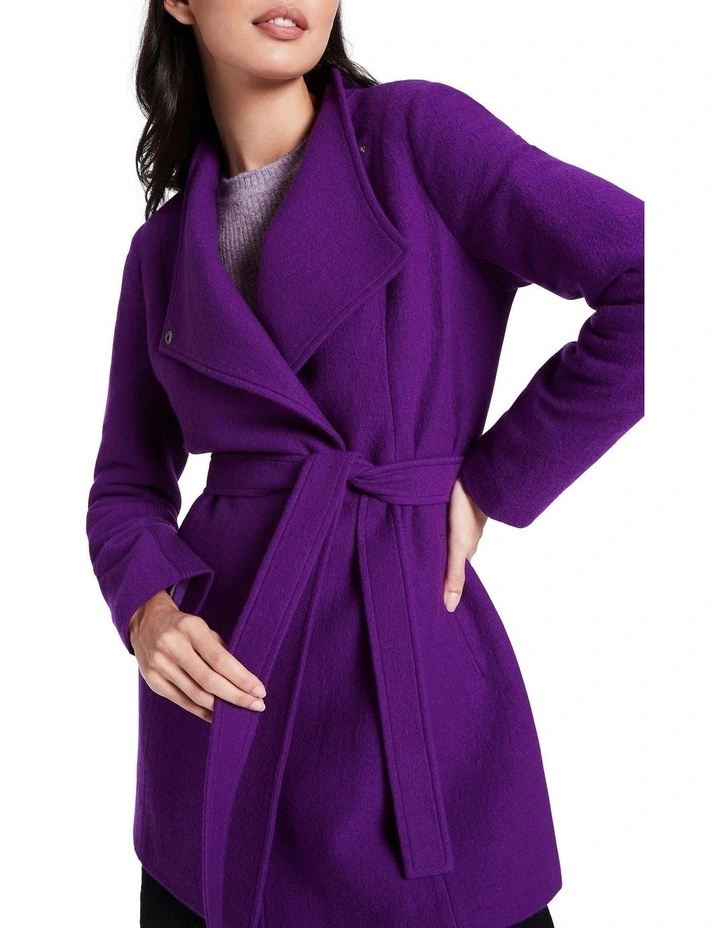 Made from pure Australian Merino wool, this royal purple coat has been knitted rather than woven to ensure easy stretch and movement, while remaining warm and lightweight. Wrapping across the chest, the coat creates a long-line silhouette, fastening with a draped self-tie belt and metal snap closure buttons, complete with pockets at the hip.Β