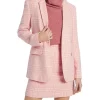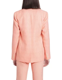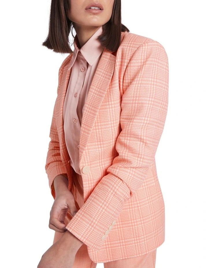 Showcasing a pale rose pink check, this blazer flatters within a longline silhouette, to fasten at the front with a single statement button. Fully lined, the blazer is made from a soft linen and cotton blend, featuring a peak lapel and collar, flap pockets at the hip, and a vent at centre-back for movement.