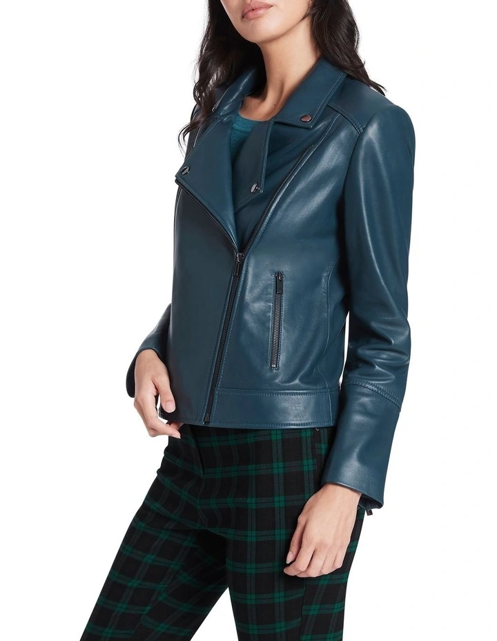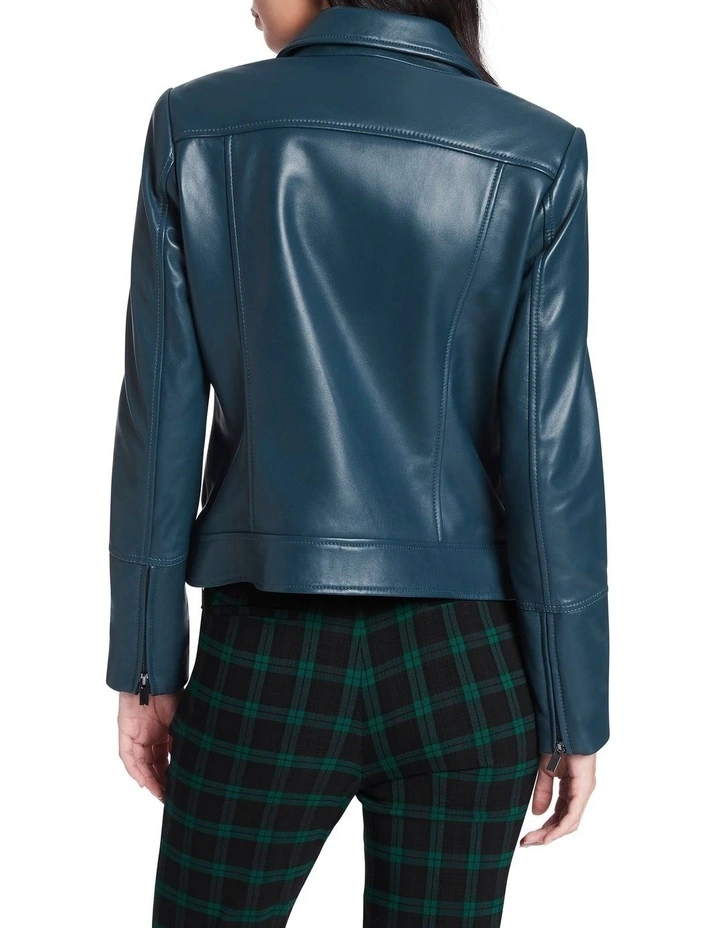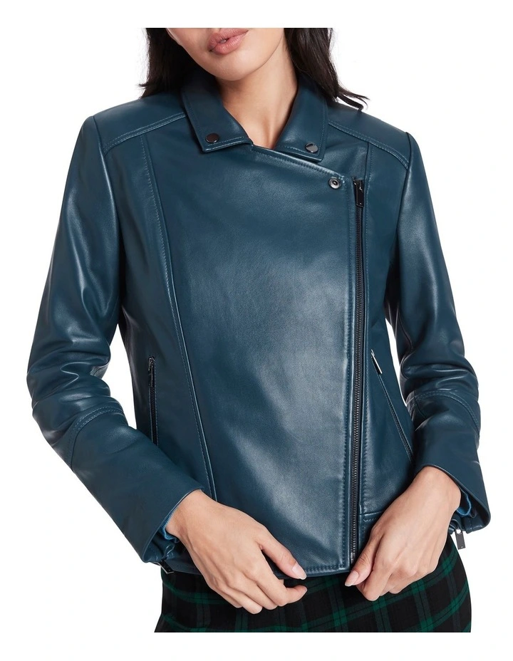 Flaunting a gorgeous petrol blue colouring, this leather jacket showcases classic biker styling, made from buttery soft leather, which is fully lined for added comfort. Revealing a tailored, slim fit silhouette, the jacket flatters further with an asymmetrically placed exposed metal zip and snap button collar, with further zip detailing found at the angled front pockets and sleeve cuffs.