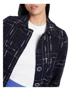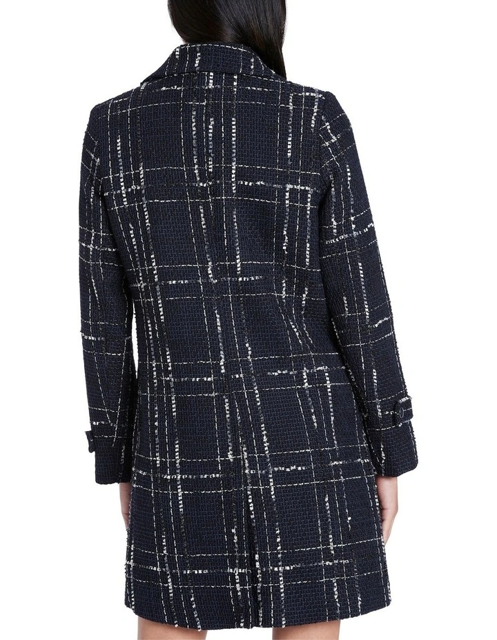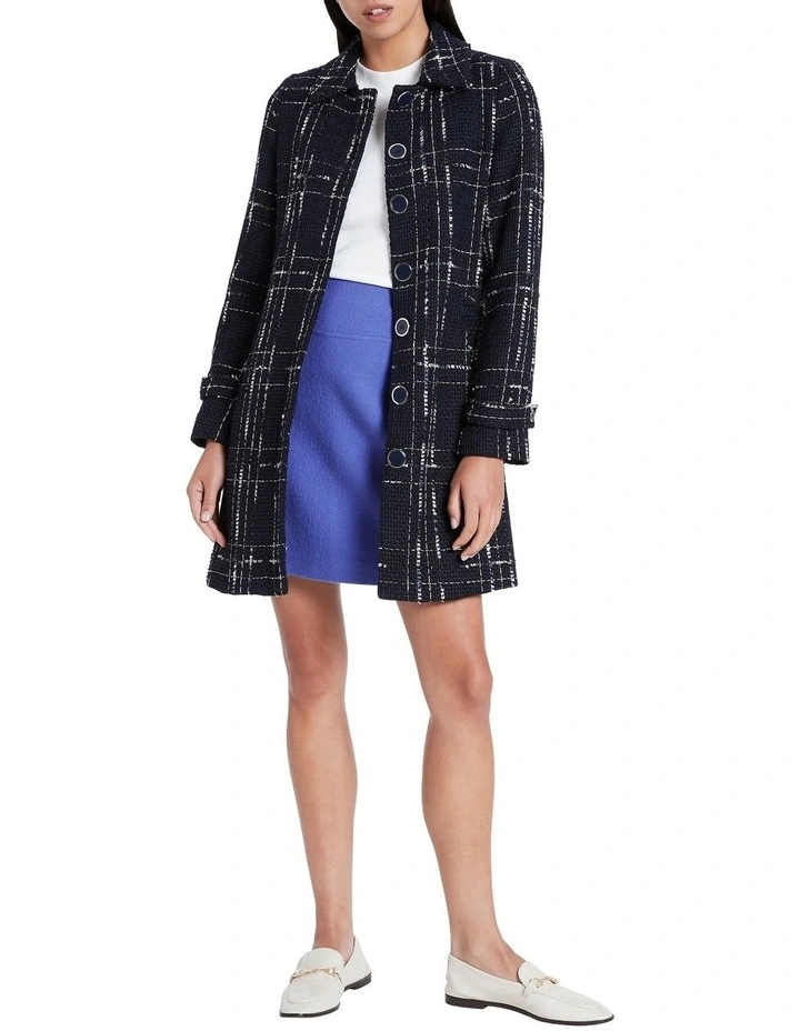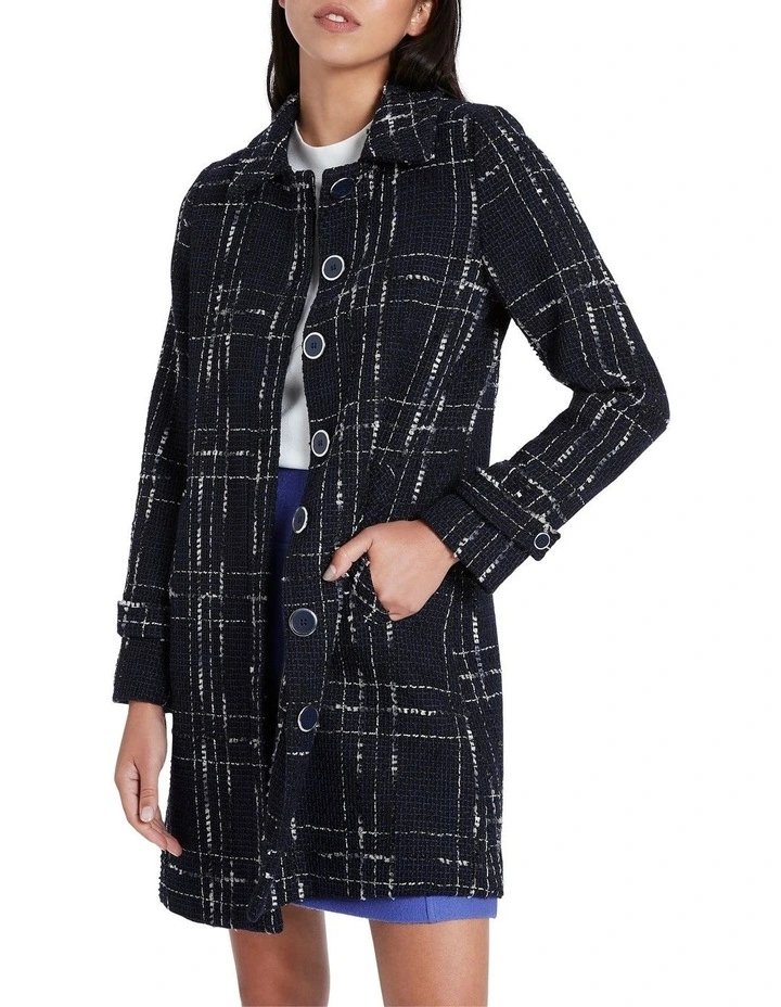 Gorgeously textured, this navy coat reveals a large check within an Italian tweed fabric, while featuring full lining for additional warmth. Creating a long-line silhouette, the coat fastens at the front with statement buttons below a full coat collar, to offer further detail in handy pockets at the hip, button detailing at the cuff, and a centre-back vent for movement.