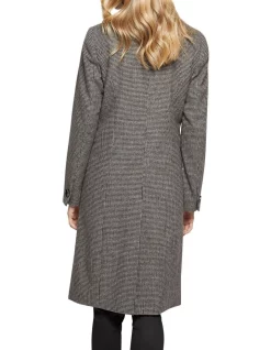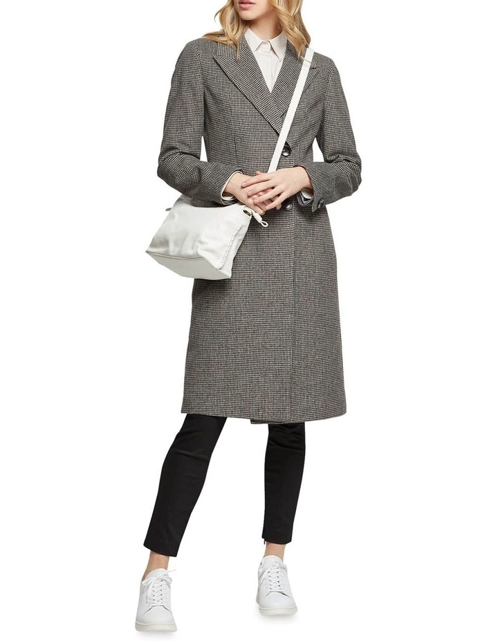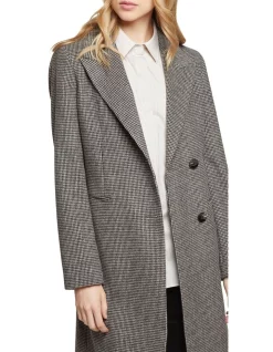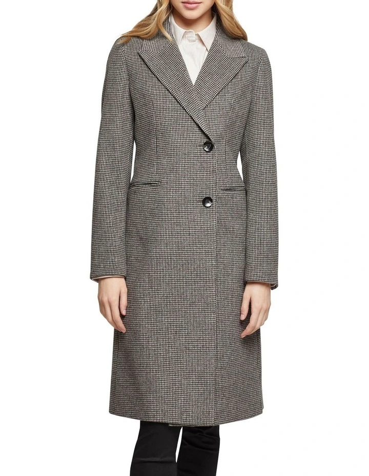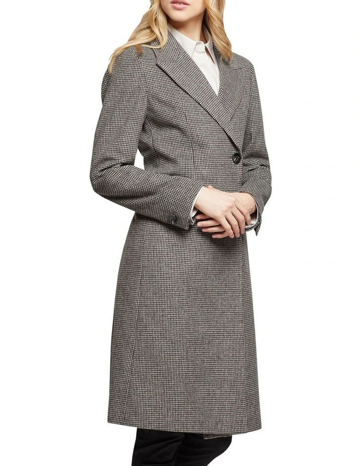 Dont leave home without the Aria Wool Rich Houndstooth Tailored Coat this winter. This smart outer layer is crafted from a wool-rich blend with a houndstooth pattern and features wide peak lapels, side jet pockets, and a single back vent. Throw it over a pinstripe shirt with slim-fit pants with a luxe scarf on your way to the office.