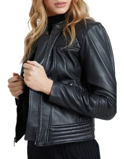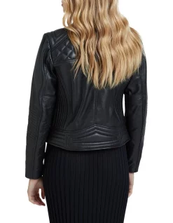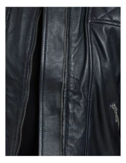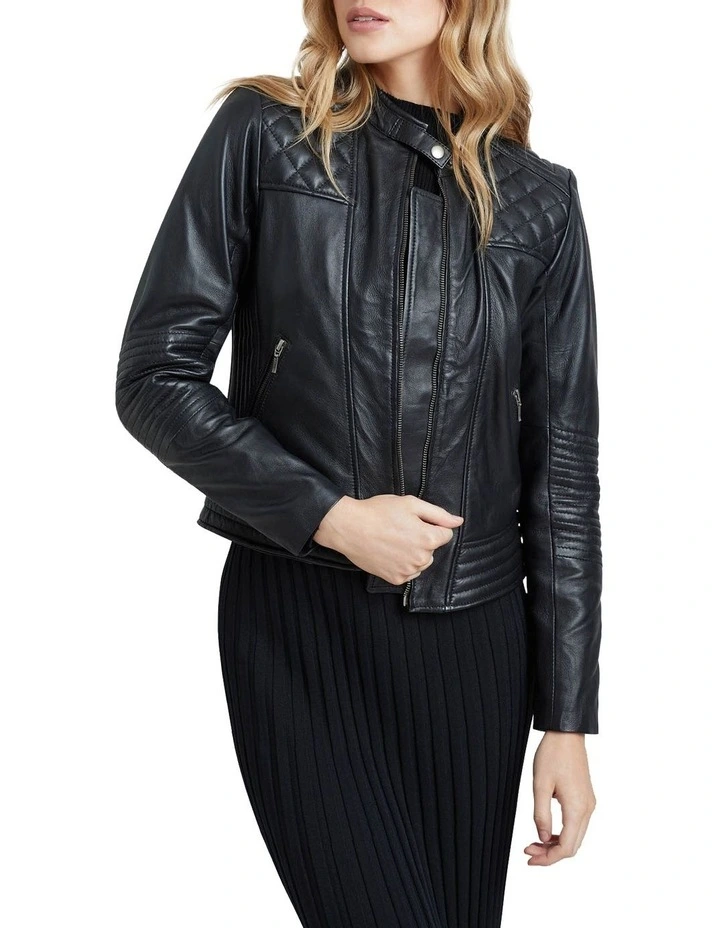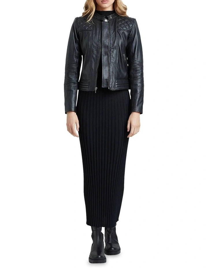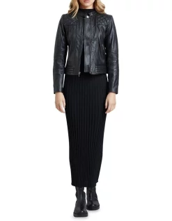Dominate the style world in the Gracie Leather Jacket. This statement piece features a moto-style collar, quilted shoulder design, arm and waist ribbing, metal zip and side pockets. It is crafted from 100% chrome-free leather; created using a process that replaces chemicals with natural ingredients, improving its impact on the environment while maintaining the quality we know and love from leather. Wear it everywhere! We think it looks great over a knitted top and skirt with boots.