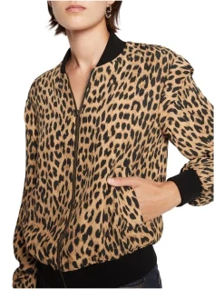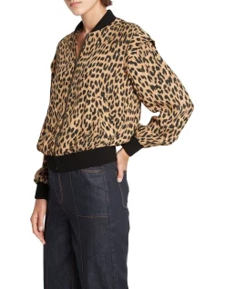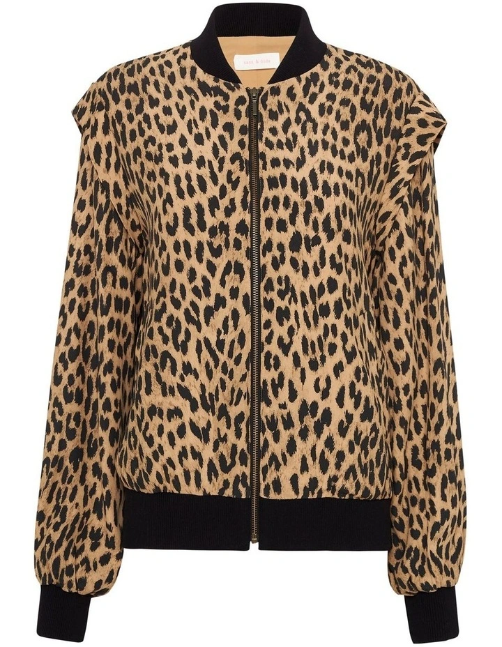 Perfect for layering through autumn and winter, this bomber jacket shows off an exclusive sass & bide leopard print, accentuated with black rib trim detailing at the collar, cuffs and body hem. Fastening at the front with an exposed metal zip, the jacket features oversized shaping that is further accentuated by a small frill through the shoulders, and angled pockets at the hip.