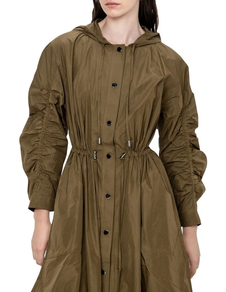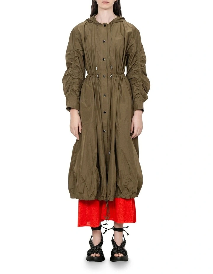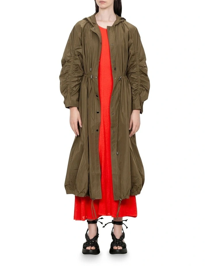 Crafted from our light and airy taffeta fabrication, this parka style jacket is the perfect layering piece to have during those warmer months. Designed with soft, gathered sculptural sleeves as well as drawstring detailing with toggle end details, this longline parka is fully adjustable, so you can wear it cinched in at the waist and buttoned up for a sophisticated look or left undone for a more relaxed look. Spring/Summer